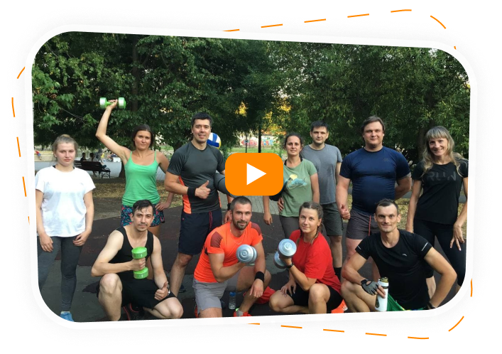 Все желающие под руководством тренера собираются для жаркой тренировки на открытом воздухе.